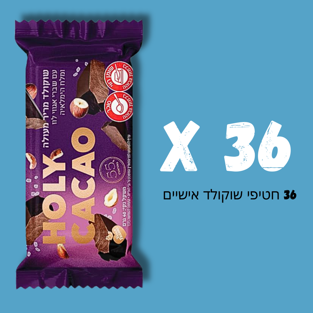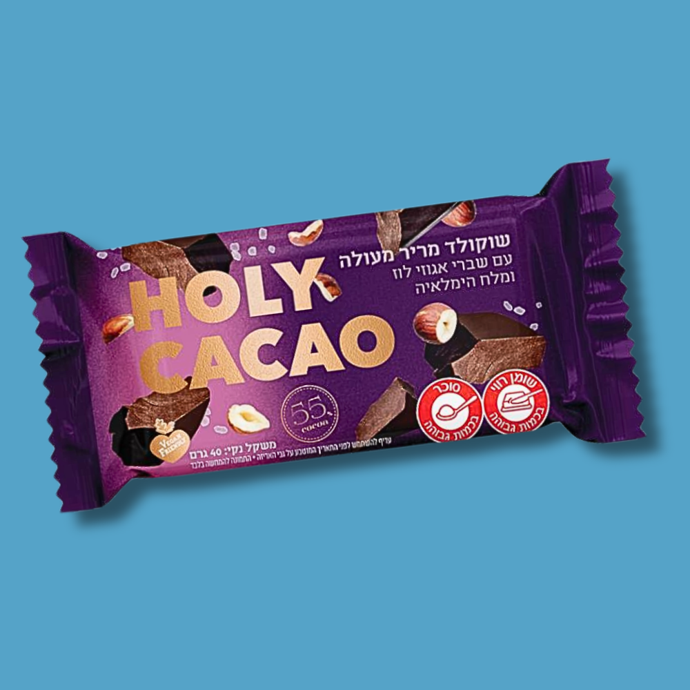 חטיף שוקולד מריר מעולה עם אגוזי לוז ומלח הימלאיה 55% מוצקי קקאו | הולי קקאו